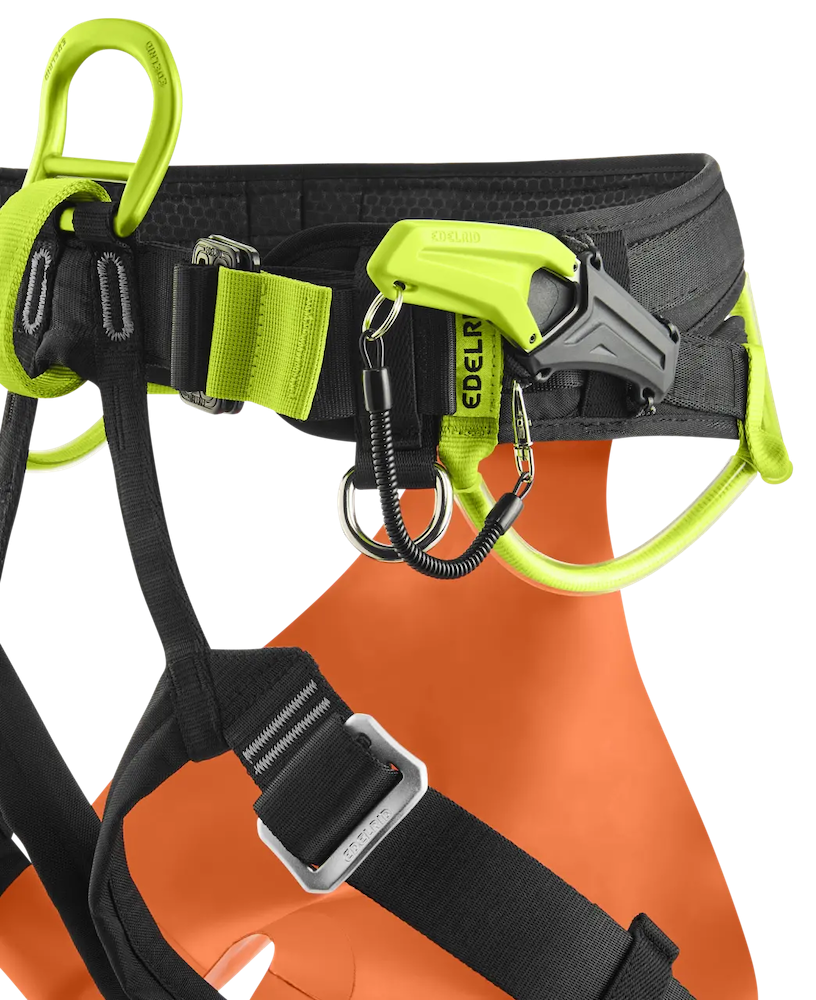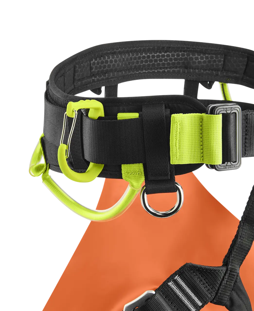Die zwei Einbindepunkte (Textil + Metall) bieten die Möglichkeit sich sowohl horizontal als auch vertikal einzubinden, bspw. für die Trennung von Abseilgerät und Selbstsicherung.