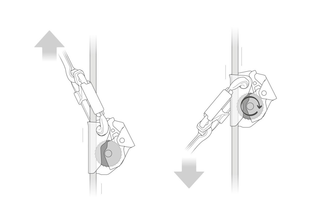Im Falle eines Absturzes oder bei einer unkontrollierten Abseilfahrt (mehr als zwei Meter pro Sekunde) blockiert das Gerät am Seil und fängt Sie auf.