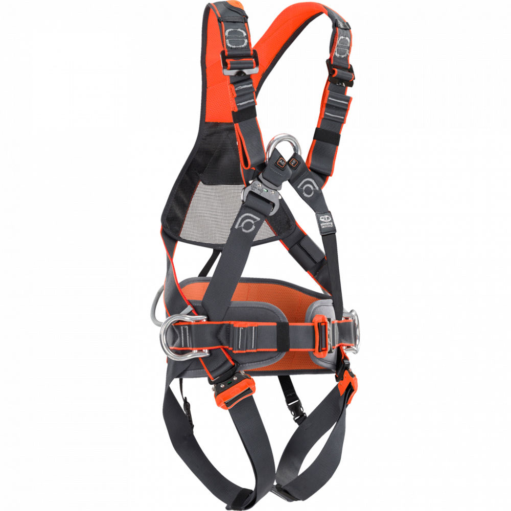Ergonomischer Auffangurt mit zwei Anschlagpunkten laut EN 361, für Einsätze mit Rückhaltesystemen und für die Anwendung mit Auffangsystemen.