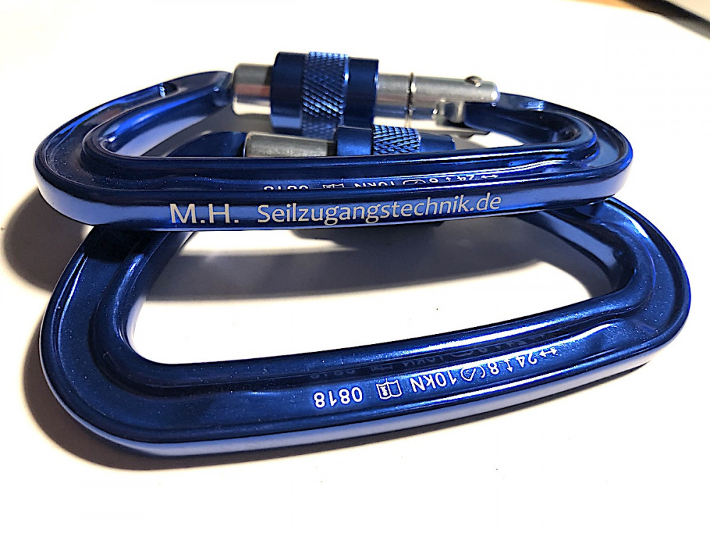 Karabiner, Abseilgeräte, Seilrollen ... alles was aus Metall (also Aluminium, Stahl, Edelstahl) gefertigt wurde ... mit abriebfesten, unverwischbaren und permanenten