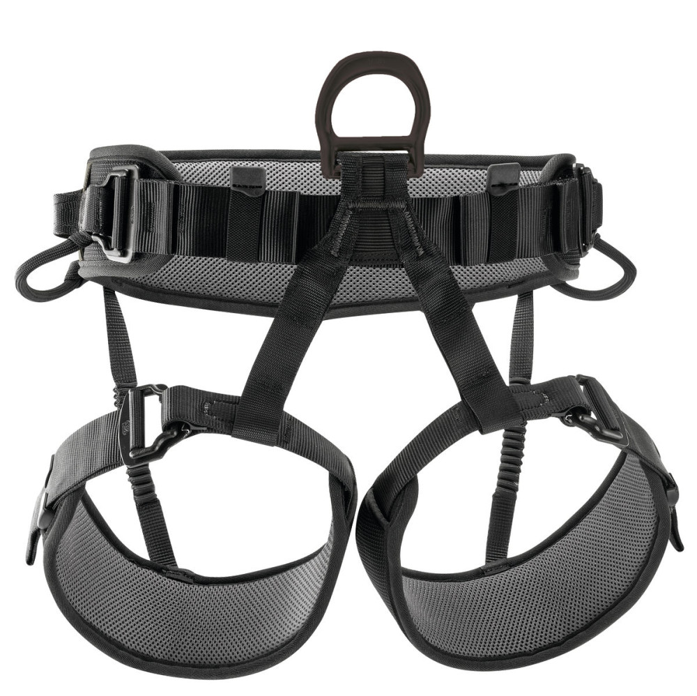 - Die ventrale Halteöse aus Metall ermöglicht die Verteilung der Last auf den Hüftgurt und die Beinschlaufen beim freien Hängen.