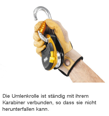 - die Umlenkrolle ist ständig mit ihrem Karabiner verbunden, so dass sie nicht herunterfallen kann